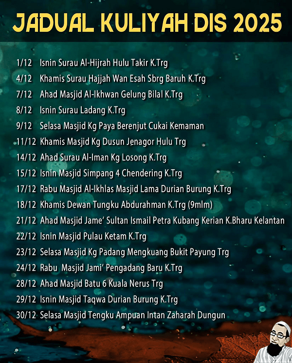 Berikut adalah Jadual Kuliah UAI untuk bulan Disember 2025. Sebarang perubahan tarikh dan lokasi serta maklumat lain yang berkaitan boleh dirujuk di page FB UAI.